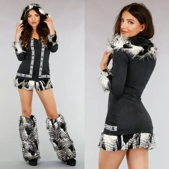 Dit prachtige kostuum is gemaakt van een soort dun fleece materiaal. Hij heeft lange mouwen en een grote capuchon met imitatiebont rand. In de nek zit een uitsnede zodat je eventueel je haar onder de capuchon uit kan laten komen. Aan de voorzijde zit een ritssluiting waar je tevens het decolleté mee kan bepalen. Het jurkje heeft leuke details en valt tot net over de bil. Aan de onderkant van het jurkje en aan het uiteinde van de mouwen zit een rand van imitatiebont. Let op! De beenwarmers zitten er niet bij. Je vind ze hier!