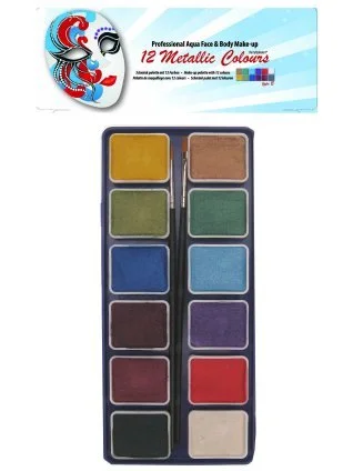 Mooie sets metallic grimeer en schminkverf in 12 kleuren vind je hier in ons assortiment. De schmink wordt professioneel gebruikt en is uitvoerig getest op effecen voor de huid. Deze schmink irriteert de huid niet en is luchtdoorlatend. Aqua schmink laat zich goed en snel verwijderen met zachte zeepproducten zoals babyzeep. De sets zijn in allerlei kleuren samenstellingen te krijgen. Er zijn aqua schminks, metallic kleuren, zachte pastelkleuren en heldere neonschminks. Met deze schminken grimeersets kunt u mooie schminkcreaties realiseren. Voor een super schminkresultaat raden wij u aan om een van onze grimeerboeken erbij te kopen. Hierin staan schminkvoorbeelden die u zelf gemakkelijk kunt maken langs een duidelijke stapsgewijze handleiding. Idee, dDeel uw creaties eens op onze facebook pagina.
