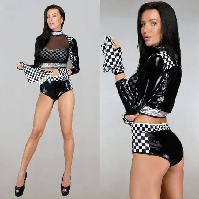 Sexy tweedelig pitspoes kostuum met een see-through bovenstuk. Aan de achterkant zit een blinde ritssluiting wat ervoor zorgt dat je hem gemakkelijk aan- en uit kunt trekken. Het gehele pak is zwart metallic, alleen een deel van de mouwen, taille, schouders en zijkant van het broekje zijn voorzien van een geblokte print. Het broekje is elastisch waardoor je er zo in kunt stappen en een sluiting dus niet nodig is. Wordt geleverd met twee geblokte handschoentjes zonder vingers, een top en een vlaggetje. Let op! Hier moet u zelf nog een stokje doorheen doen.