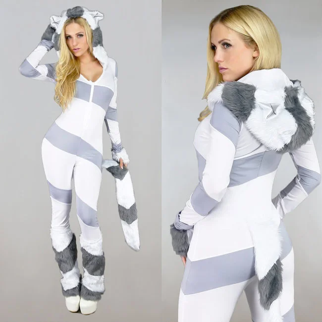 Dit kostuum heeft lange mouwen en een capuchon. Aan de achterkant zit een furry staart. Aan de voorkant zit een ritssluiting. De capuchon heeft een bont overlay en twee oortjes. De handschoentjes zijn open en hebben een bontje. De beenwarmers met bont zijn elastisch aan de bovenkant.