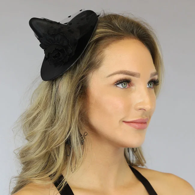 Trefwoorden: zwart heksen hoedje, thema hoed met clips, halloween, punker, gothic, steampunk, tule strikje, polkadot patroon, partywear, carnaval accessoires